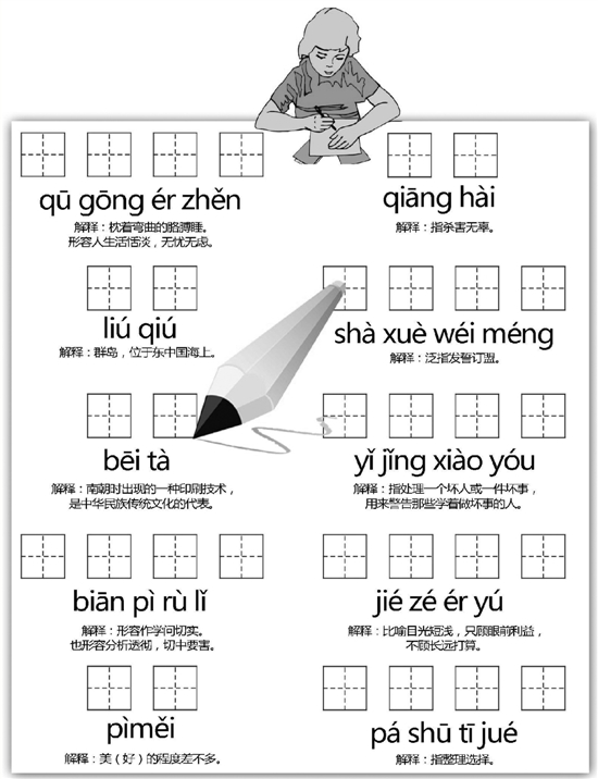 以下配图中,我们选了初中生容易写错的十个成语和词语。你不妨提起笔写写看(图内“田字格”答案在本版自找)。