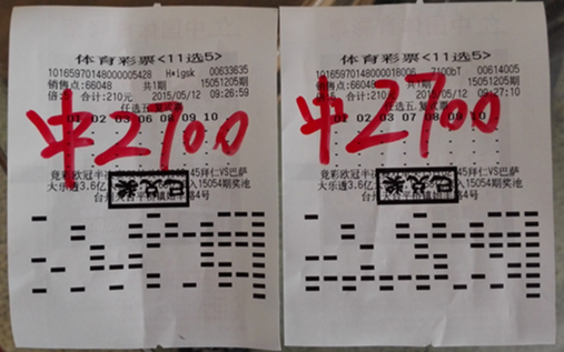 进入体彩销售网点后,离开奖还有5分钟的时间,陈先生马上看起走势图。经过分析,发现这期走势跟昨天的有点相似,便大胆的打了两张七码复式,并分别倍投五倍。当期号码开出后,陈先生果然中了,收获奖金5400元。
