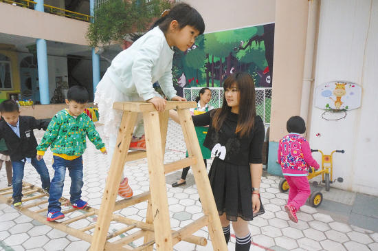 而就在这时,结束了团体运动的两个小朋友因为荡秋千发生了争执。在封玮玮的引导下,这场争执以微笑礼让的方式收场。“心态和处理人际关系的方式从小养成之后会影响人的一生,这些具体的处理方式在学校里是学不到的,都要在工作中不断积累。”封玮玮说,工作之余,她会用很多跟幼教有关的书籍来充实自己。