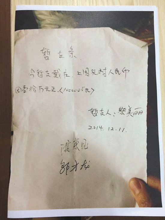 记者到村会计邬才喜家了解情况。“书记和村长都签字了的。”在邬才喜家,记者看到了2014年12月11日支出10万元的暂支条,上面署名是蔡某某,下面有村党支部书记和村委会主任两人的共同签名。