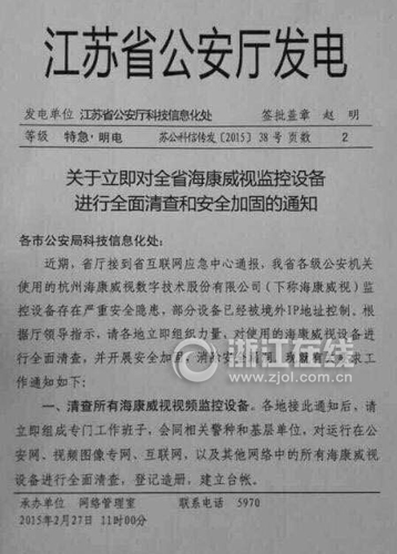 这份通知当中指出,近期,江苏省各级公安机关使用的海康威视监控设备,“存在严重安全隐患”,“部分设备已经被境外IP地址控制”。文件要求,“各地对使用的海康威视设备进行全面清查,并开展安全加固”。