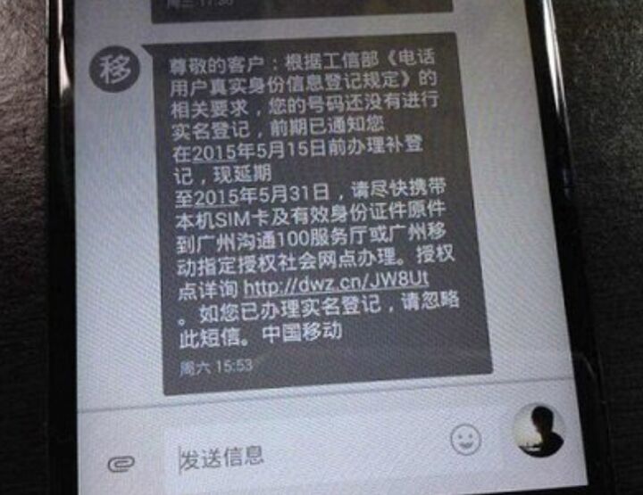 近日有用户收到了10086发来的短信称:根据工信部《电话用户真实身份信息登记规定》的相关要求,您的号码还没有进行实名登记,前期已通知您在2015年5月15日前办理不登记,现延期至5月31日,请尽快携带本机SIM卡以及有效身份证原件到广州沟通100服务厅或广州移动指定授权社会网店办理。