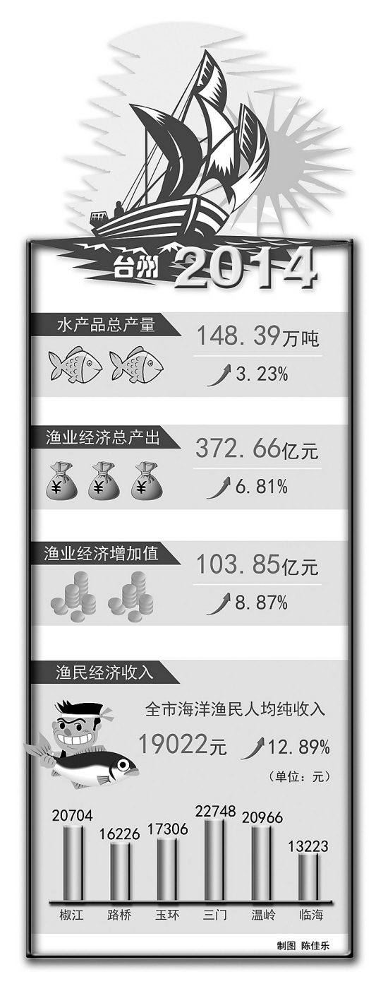 据介绍,渔民人均收入增长,原因有三:一是渔业油价补助政策的作用。2014年中央财政下拨台州的渔业油价补助资金19.64亿元,与上年基本持平。以主机功率400千瓦为例,刺网渔船可获油价补助66.6865万元;围网渔船可获油价补助72.7489万元;拖网渔船可获油价补助70.9745万元,油价补助对渔民收入增加作用明显。二是柴油生产成本直线降低。据温岭市的调查显示,渔民使用的燃料油为4800元/吨,较原先降1/3。渔村海洋捕捞成本48.12万元,同比减0.66%。三是渔民收入渠道增多。如第三产业毛收入26.4亿元,增长66.67%;投资收益1.97亿元,增长139.59%;劳务收入5.28亿元,增长37.3%。