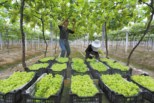 今年,“中国大棚葡萄之乡”温岭五万多亩大棚葡萄获得丰收,每亩收入两万元左右。图为5月20日,新河镇上莫村村民正在采摘葡萄。