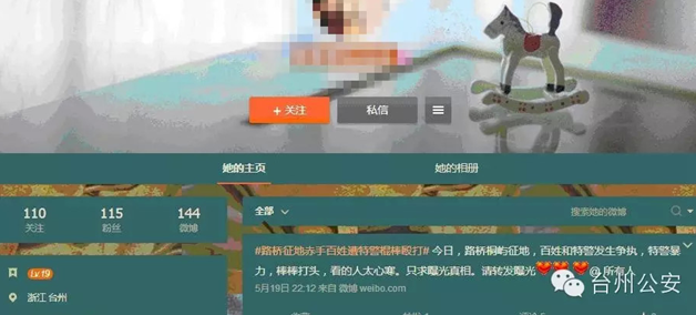 5月19日晚,一网民在其微博转发“路桥特警打人”的视频,且作出以下评论:“#路桥征地赤手百姓遭特警棍棒殴打#今日,路桥桐屿征地,百姓和特警发生争执,特警暴力,棒棒打头,看的人太心寒,只求曝光真相。请转发曝光@所有人。”