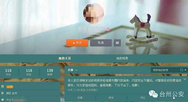 经查,微博发布者为蔡某,女,23岁,路桥桐屿人,在丽水工作。在未核实“路桥特警打人”信息真实性的情况下,即在自己的微博上予以转发评论。5月20日晚,路桥警方通过蔡某的父亲告知蔡某其行为违法后,蔡某立即主动将该微博删除。