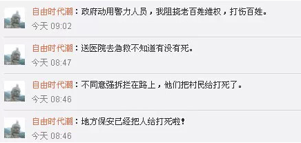 19号上午,网民“自由时代潮”在新浪微博上发布信息,声称“地方保安已经把人给打死啦!”、“政府动用警力人员,阻挠老百姓维权,打伤百姓。”。