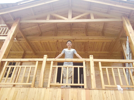 “这些木屋,都是由4厘米厚度的杉木板搭建而成,木板间不用胶水,以雌雄扣相接,十分牢固。”在木屋别墅的样品房里,顾豪丞为记者作着详细的介绍,“木屋结构牢固,防震防台风能力强,而且造价实惠,每平方米约在1500元左右。”