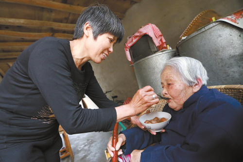 图为5月21日上午,朱定珍在喂婆婆吃桂圆汤。本报记者牟永选摄