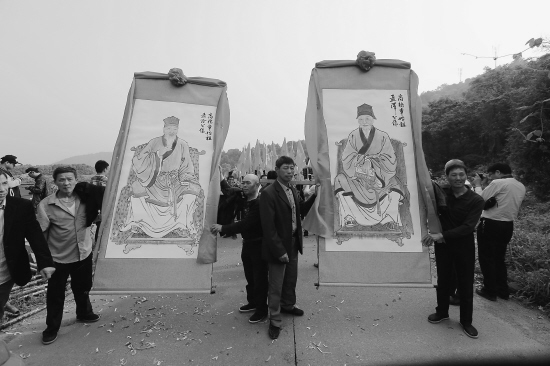 祭祀仪式结束后,近千人的队伍从新庄出发,抬着先祖画像、族谱,举着章氏彩旗,在鼓乐引导下,沿途直至高桥章巡游。