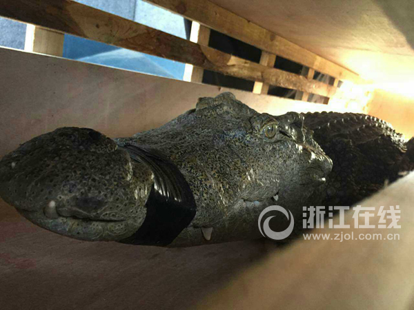 “木箱打开时着实吓了一跳”,邵警官说,一只成年鳄鱼瞪着两只大眼睛恶狠狠地盯着自己,只有嘴巴用胶带纸捆住,并无其他防护措施。
