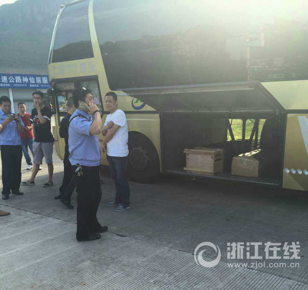 台州高速交警四大队民警邵警官告诉记者,当时警方在做例行检查。打开这辆客车行李厢时,散发出一阵异味。民警往里看,发现行李箱底部放着一只木箱,一只动物尾巴露在外面,木箱内不时传来叫声。