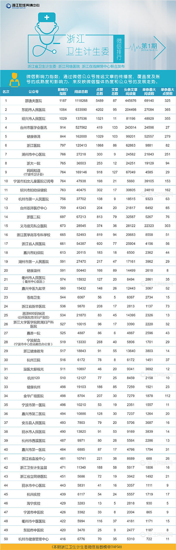 原标题: 浙江在线发布首期浙江卫生计生委系统微信排行