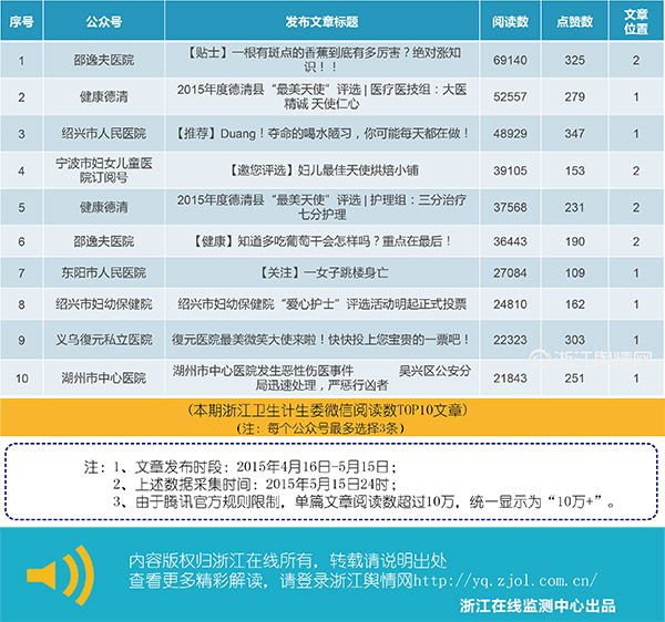 热闻榜劲刮“本地风”,“最美天使”评选获广泛关注。本期最受网友关注的10篇微信,“邵逸夫医院”、“健康德清”各占2篇,“绍兴市人民医院”、“宁波市妇女儿童医院订阅号”、“东阳市人民医院”、“绍兴市妇幼保健院”、“义乌复元私立医院”、“湖州市中心医院”各占1篇。“邵逸夫医院”发布的《【贴士】一根有斑点的香蕉到底有多厉害?绝对涨知识》总阅读数69140次,为网友最关注的文章。在阅读量TOP10文章中,7篇为本地信息。如前文提及,“健康德清”发布的《2015年度德清县“最美天使”评选|医疗医技组:大医精诚天使仁心》、《2015年度德清县“最美天使”评选|护理组:三分治疗七分护理》等,受到了公众的广泛关注,实现了较好的传播效果。