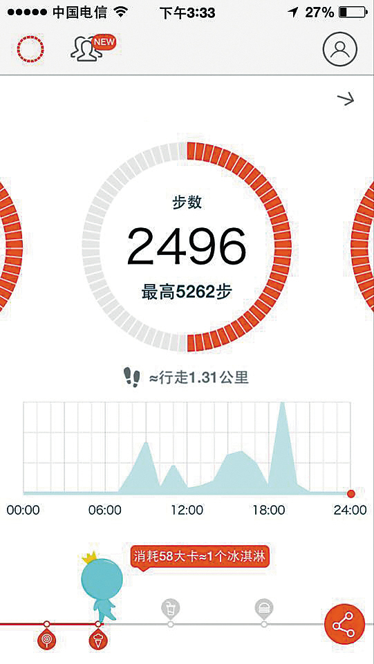 “它可以24小时监测卡路里,你所要做的只是设定好消耗卡路里目标数就可以了。打开机器输入希望减轻的体重后,它就会自动设定你每天所需要的目标消耗热量,然后你就坐等轻松瘦身吧!”记者在此次实验中发现,目前很多人下载计步器软件是为了减肥。