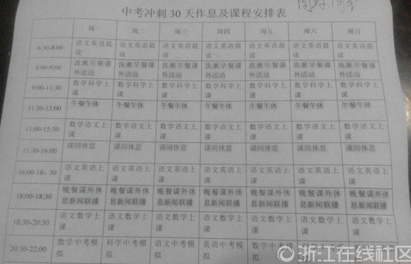 在该家长提供的一份《中考冲刺30天作息及课程安排表》中,清晰列出了中考冲刺班学生每天的时间安排,表格从每天早上6点半到晚上10点共列有10项安排,学生作息安排精确到分钟。