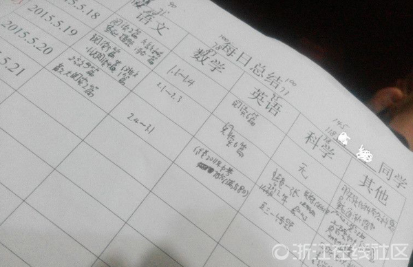 除了安排表,每位参与的学生还会拿到一份每日总结表,用来记录每天每门学科的学习进展,如某某某5月19日完成了英语6篇阅读、数学3份练习、科学考卷1篇(2012年)、语文5篇阅读、小说阅读4篇、议论文1篇等。