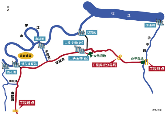 改善水环境后,工程还将发挥“防洪水”的作用。东官河综合整治工程将拆除重建山头泾闸,另外新建外东浦泵站、西江泵站,以增加排洪流量。另外通过河道疏浚、河面加阔,降低黄岩城区水位,排涝标准也将达到20年一遇。整治后,东官河河道拓宽,东官河的航运能力也会提高。