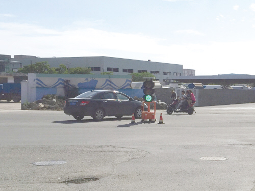 在台州经济开发区机场路和体育场路交叉路口,过往车辆只能靠临时信号灯来“指挥”。徐 晔摄