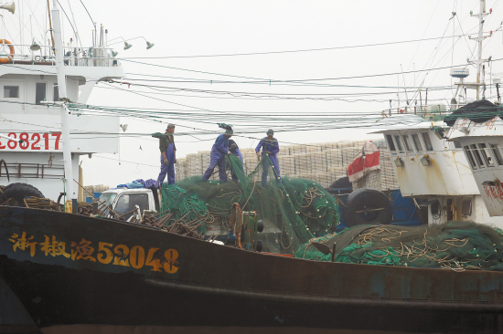 昨日,在椒江一码头,渔民正在装卸渔具。今天起,为期3个月的东海伏季休渔期开始,这意味市场上的新鲜海产品将大量减少,价格也将有所上涨,而冰冻的、养殖的水产品会大量供应市场。