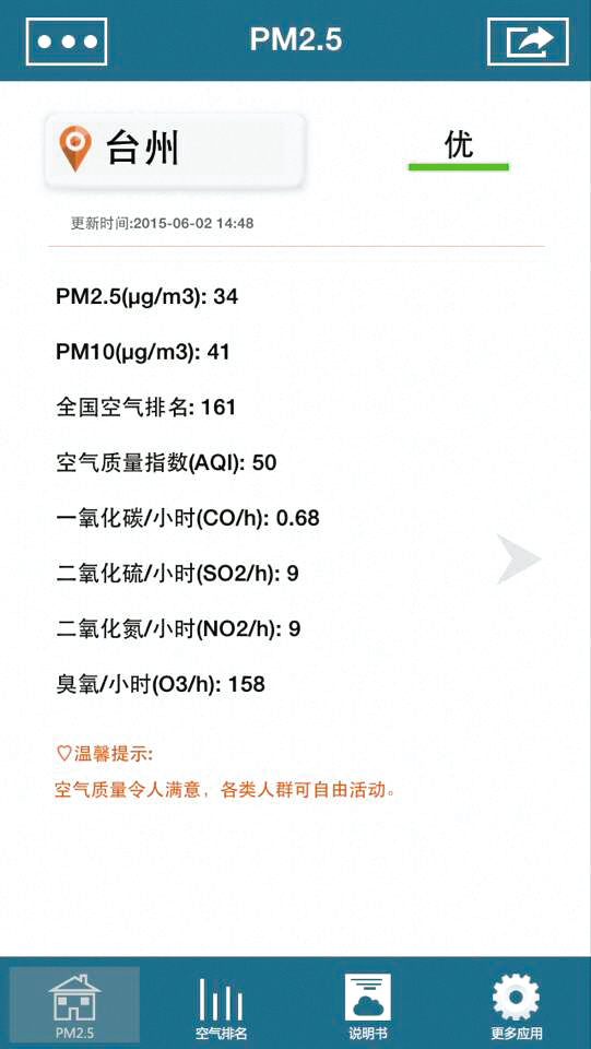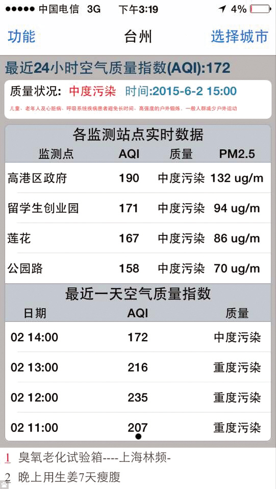 实验时间:6月2日实验软件:墨迹天气、PM2.5、空气质量、中国空气质量指数