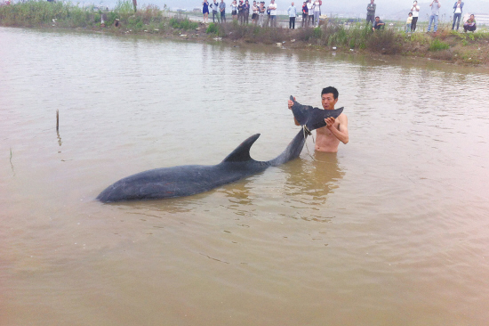 许多村民试着将它拉回海边,但是由于海豚实在太重了,村民们无能为力。为了对这条海豚进行施救,当地政府部门调来了一条小型机动泡沫船配合村民,试图将海豚拉回咸水区。
