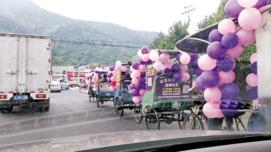 同样在这一天,另一场在黄岩十里铺举办的婚礼,也受到了网友的关注。接新娘的是一溜黄包车,小小的黄包车被大把粉色、紫色气球装饰得非常浪漫。