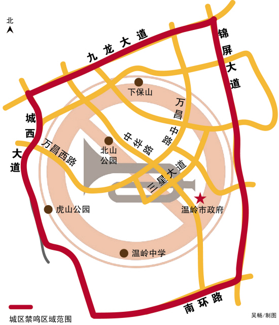此次禁鸣的区域范围包括城西大道(含南延路段)以东、九龙大道以南、锦屏大道(泽坎线)—东环路以西、南环路以北,呈四方形,囊括了温岭老城区、九龙新区等车流密集区域。
