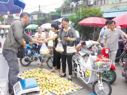 不远处一个卖桃子的摊点前,围满了争相挑选桃子的人,停放的电动车、自行车占了大半个马路。一旁的市民只能见缝插针,穿过车流挤着走。