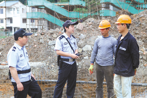 高考在即,黄岩公安分局认真做好高考安保工作,提前对考点周边进行排查。图为6月3日,该局城东派出所民警在巡查中,向考点附近工地的施工人员宣传高考期间停止施工的有关规定。