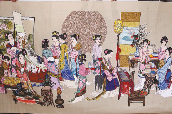 王静绣东西从来都不拿到室外,只摊在床上或者桌子上绣,这样能保持绣品的整洁。为了保证绣品的平整,走针的时候不能横式走针和竖式走针相互混杂,这是保证绣品质量的关健。