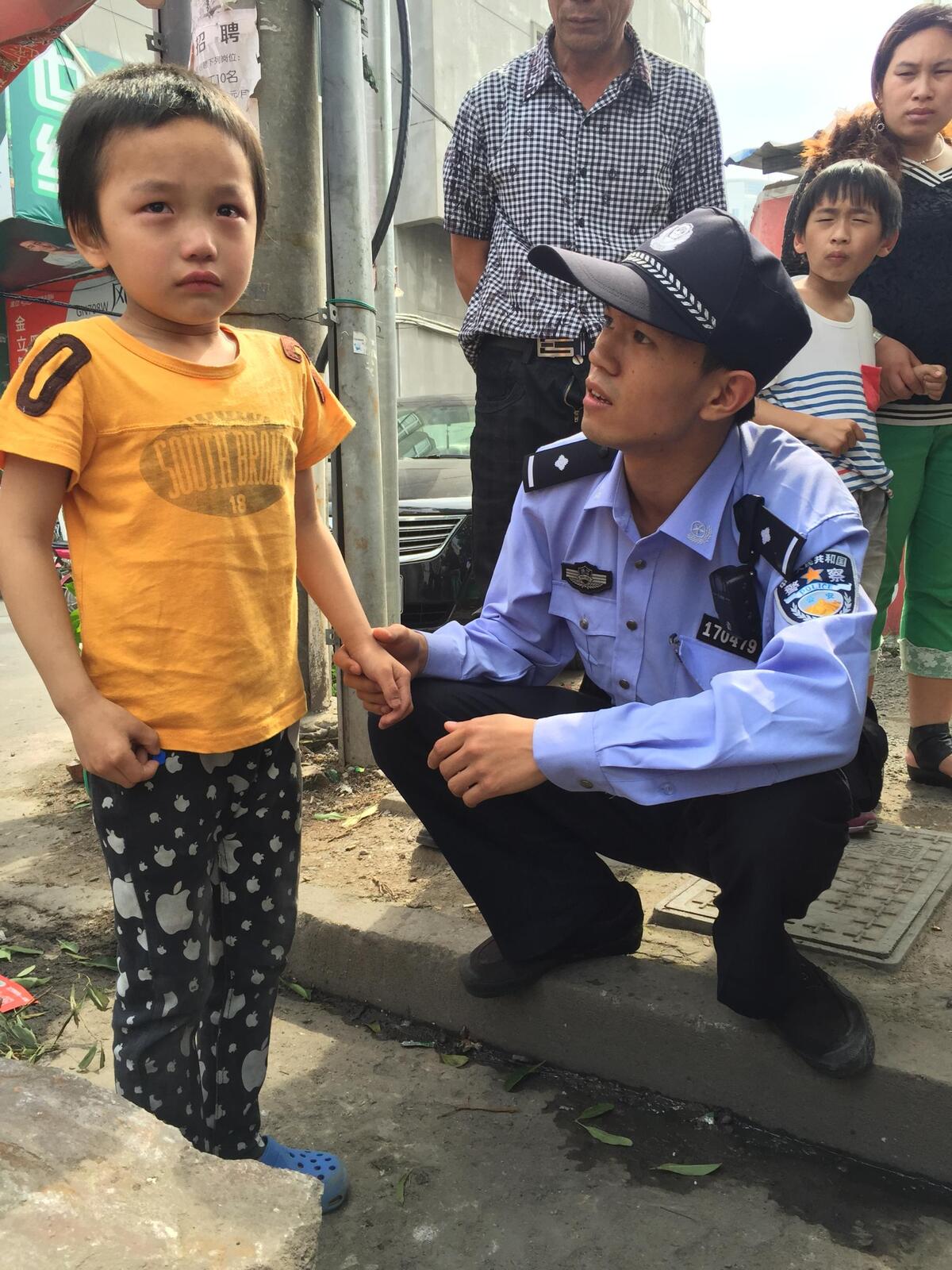 民警蹲下身子,牵住他的小手询问男孩信息。男孩一直不说话,倒也停止了哇哇大哭,眨巴着眼睛望着民警。民警见男孩不排斥自己,便先哄着男孩上警车,准备带他在附近转一圈,希望男孩能够记得回家的路。