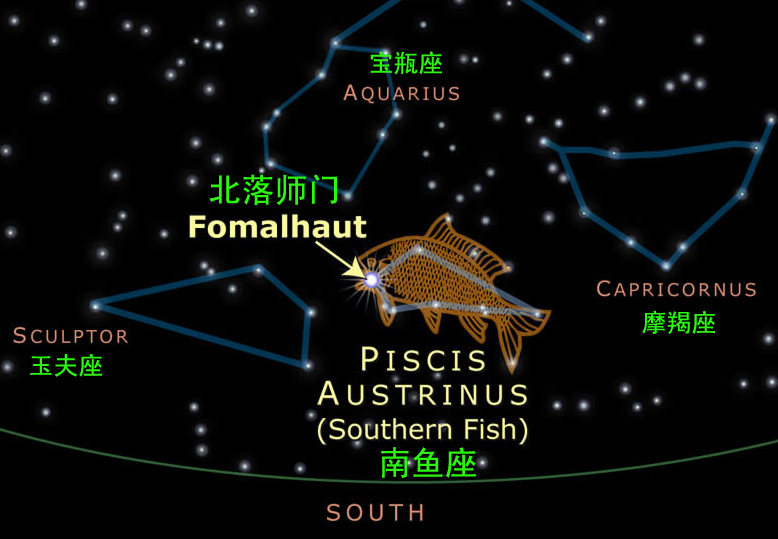 北落师门(Fomalhaut,南鱼座α星)属北宫玄武的室宿,同时也是南鱼座的主星,距离地球约25.1光年。其视星等为1.16,属一等星,是除太阳外,在地球上能看到的第18位亮星。