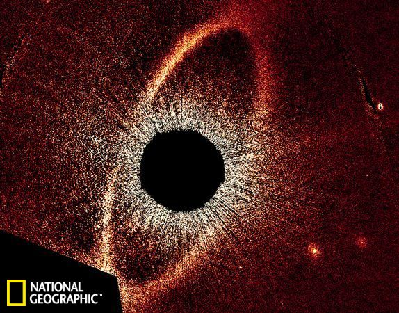 哈勃太空望远镜观测到的新行星,环绕其母星座北落师门轨道运行的北落师门b。科学家称这是第一次拍摄到的一颗行星绕一颗恒星运转的可见光快照。