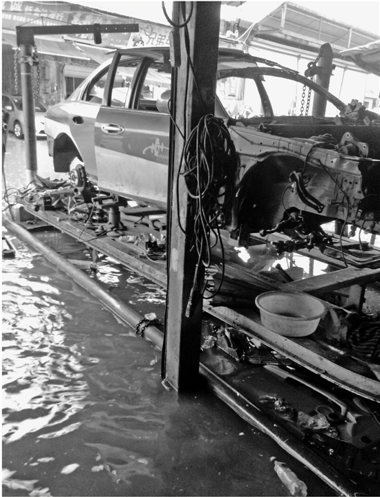 “我们昨天晚上看着外面的积水一点点多起来,但就是排不掉,雨越下越大,就弄成现在这个样子,积水最浅的地方都有30公分了。”办公室外的维修间里,一辆正在修理的出租车由千斤顶支起,但积水都快要淹到千斤顶的支架了。“这还不算深的。”老陈领着我到隔壁的喷漆间,房间里到处漂浮着油漆桶和垃圾,水面上还有一层层的油污。