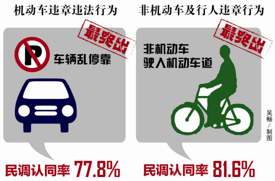 近日,记者从市统计局社情民意中心获悉,5月上旬的城市交通状况调查显示,我市市民认为车辆乱停靠现象是机动车最为突出的违章违法行为,而非机动车驶入机动车道则在非机动车及行人违章违法行为中排第一。