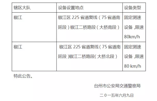 为了进一步加强道路交通管理,交通管理部门根据椒江二桥的实际交通运行状况,将二桥路段全线限速由原来的60km/h,提高到80km/h。台州市公安局交通警察局将椒江二桥的测速抓拍限速值相应提高到80km/h。根据相关法律规定,现将监控设备设置地点予以公布。希广大驾驶人遵守交通法规,按照交通信号指示通行。