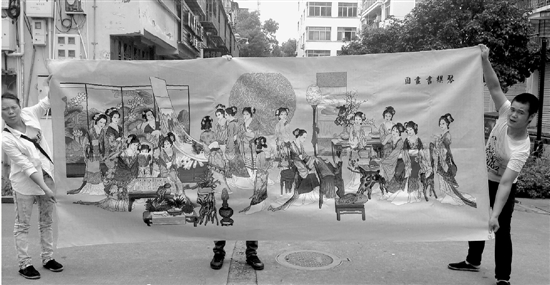 这幅《琴棋书画图》长3.2米,宽1.5米,需要三个人才能将其完全平展开来。(右一男子便是王静)
