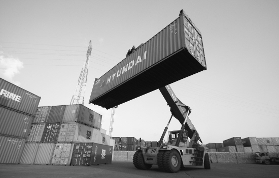 在台州港务有限公司集装箱堆场,大型机械设备正在搬运集装箱。商报记者李昌正摄