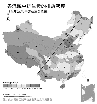 报告指出,以地理学上著名的“胡焕庸线”(中国地理学家胡焕庸1935年提出的划分我国人口密度的对比线,也称为“黑河-腾冲一线”)为划分,人口较密集的东部,抗生素排放量密度是西部流域的6倍以上,可见人类活动对抗生素排放的巨大影响。