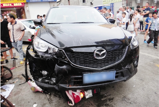不知道发生了什么,等她回头看时,见一辆车子开得很快。一开始,她以为车子不会朝她开来。没想到,车子很快就“砰”地撞了上来。她被撞倒在地。爬了起来一看,三轮车被压扁了,旁边的小女孩也被擦伤。