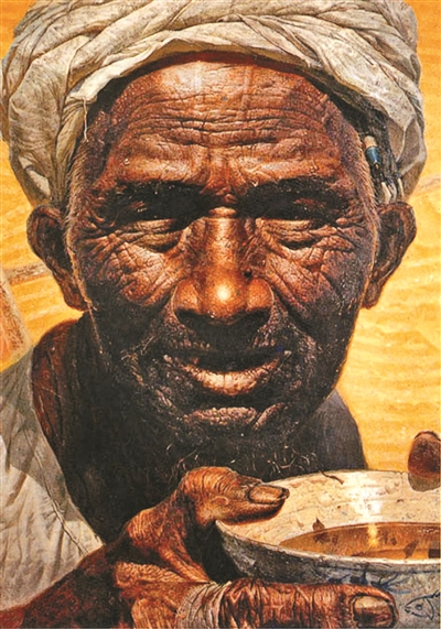 最终,罗中立去掉了旧军帽和军用水壶,将形象还原成了最普通的农民。象征着丰收的金色背景与撑满画面的褐色面孔形成了鲜明的对比,生活的艰辛贫苦在他的脸上留下了密布辙痕般的皱纹,干裂的嘴唇和渗出的汗珠似乎暗示了他刚从烈日下的田间劳作中得以喘息,树皮般粗糙笨拙的双手正将盛在粗瓷碗中的酽茶送到嘴边。