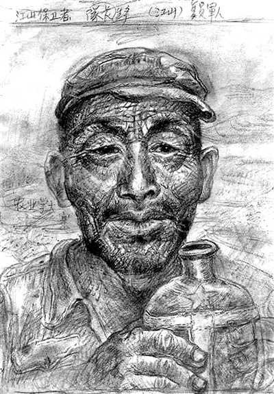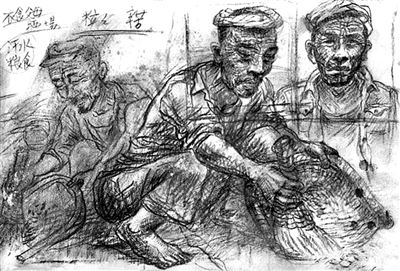 这种情感内涵和视觉追求,推动了罗中立逐渐把心目中的农民形象,从《守粪农民》的情节环境中不断放大,凸显为一个近距离俯身捡拾粮食的身影。然而,罗中立对于这个几乎撑满画面的农民形象仍不满意,在接下来以邓开选老人为原型的《生产队长》中,他干脆只留下一张布满皱纹的脸庞,让这饱经沧桑的面容赫然矗立在观众面前。这幅《生产队长》的画稿,罗中立还给它起了一个名字叫《江山保卫者》,他想传达的是:这些贫苦的农民在养活了我们的同时还保卫了这个国家。从这一稿的视觉效果来看,它已经很接近于罗中立最终创作完成的《我的父亲》,但占据整个画面的面孔所对应的内涵似乎还是狭窄,距离那种能够令每一个观众动容的典型农民形象仍有距离。