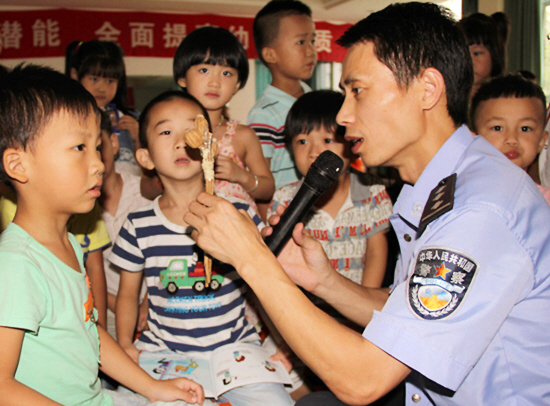 6月26日国际禁毒日来临之际,椒江区公安分局的社区民警走进各中小学和幼儿园,向学生们讲解毒品的危害及抵御方法。图为6月19日上午,椒江区公安分局海门派出所民警正在幼儿园向孩子们讲解毒品的危害。