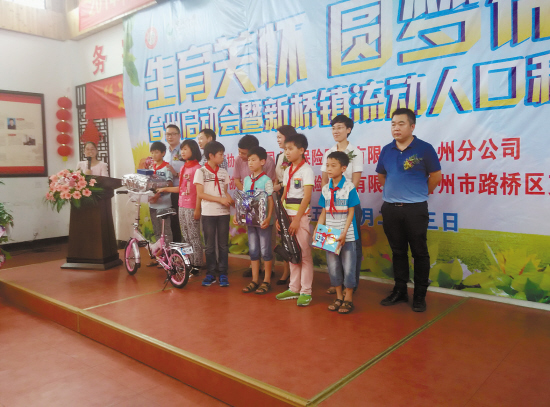 昨天上午,台州市“生育关怀·圆梦微心愿”启动会暨流动人口积分兑现会在路桥区新桥镇召开。来自路桥区新桥镇长泾小学、求是小学、新民小学的近百名外来务工人员孩子实现了自己的微心愿。