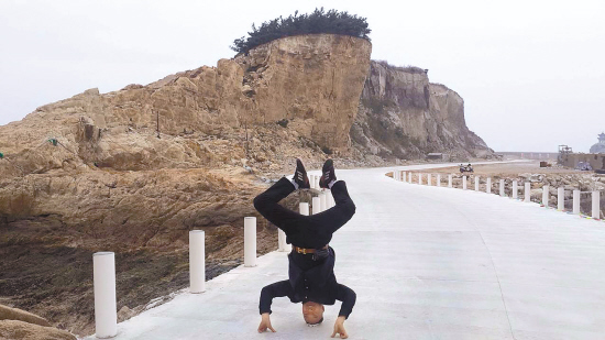 他今年64岁,倒立10多分钟没问题,双脚还能变换各种花样