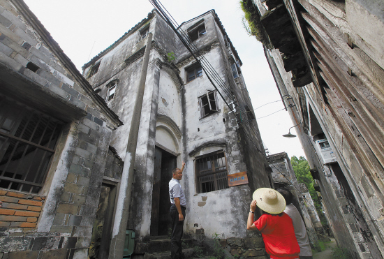 6月28日,在天台县南屏乡山头郑村,南屏乡乡长谷峰向客人介绍民国时的洋房。