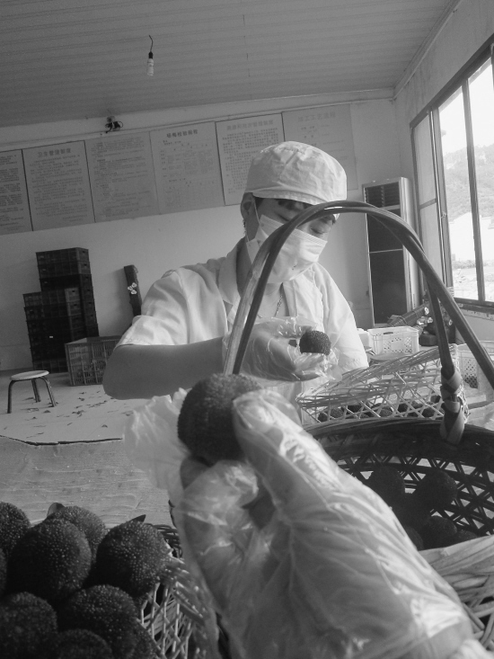 仙居仙梅实业有限公司的员工用天平秤给杨梅称重后再进行分类。