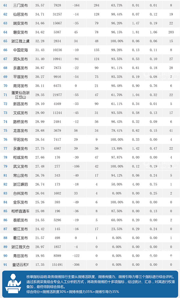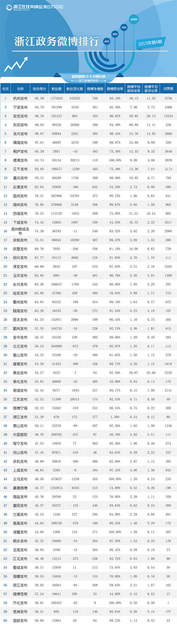 本次影响力排行榜以浙江各地新浪官方微博为研究对象,选用数据自2015年6月1日至2015年6月30日。下图为本期完整榜单。