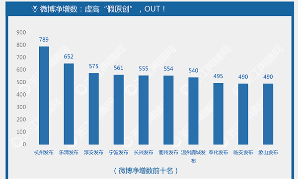 6月,91个参与排行的账号共发布微博21382条,其中原创17848条,与上月的21123条和18115基本持平。“杭州发布”、“乐清发布”、 “淳安发布”领衔的9账号保持稳定态势,名次略有调整,另有“温州鹿城发布”跻身前十。这年头,微博原创率能保持在100%的筒子已经不多啦,因此“德清发布”、“诸暨发布”、“义乌发布”等地小编的原创态度相当值得肯定。当然,拥有可读性强的内容始终是王道,排行君发现,一些看似原创性高的微博实为复制粘贴自当地媒体报道或由下属市局直接报送,没有充分利用和展现微博新媒体的特点。对于类似内容形式均极简的新闻摘编,还是要勇敢说:OUT!此外,“浙江微天台”、“童话云和V”、“青田发布”三位仍然未更新。